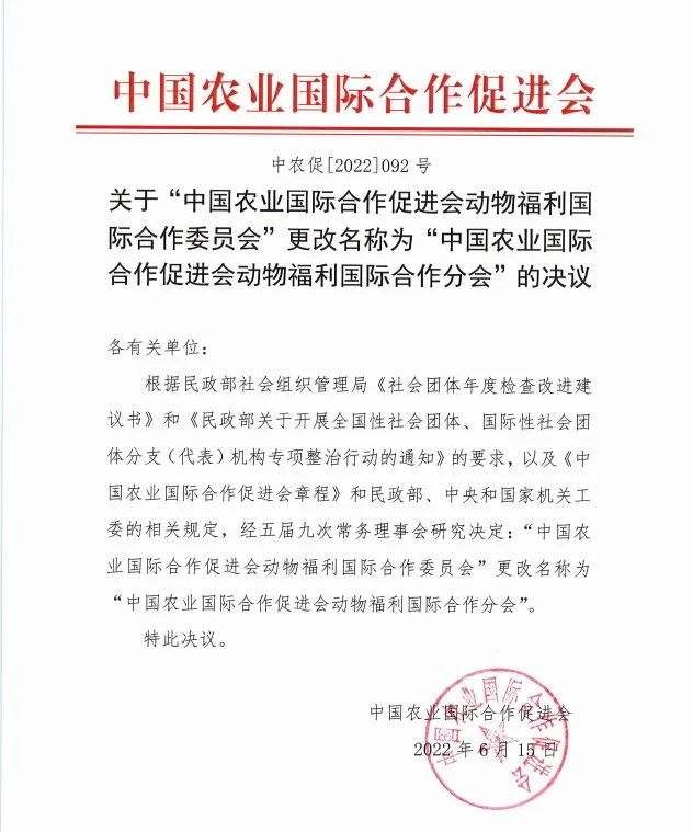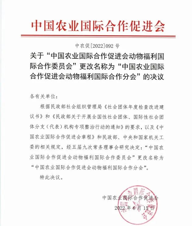 更名为“中国农业国际合作促进会动物福利国际合作分会”;